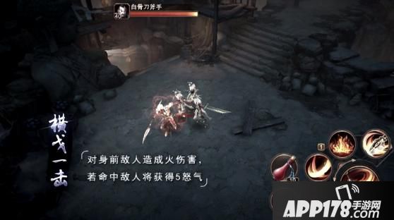 横戈一击,对身前敌人造成火伤害,若命中敌人将获得5怒气。