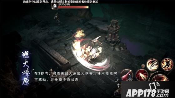 怒火燎原,在3秒内,对周围敌人造成火伤害,使用技能时可移动,并免疫不良状态。