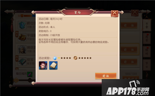 玩家到达23级即可参加冒险活动,在冒险NPC处选择冒险地图后,前往该地图找到冒险发现物,可以触发随机事件。随机事件是各种趣味性的小玩法。完成随机事件可获得藏宝图、武将、白金武将碎片等奖励。