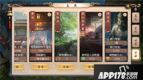 点击任务头像选择贡献栏,拖到最后就看到你的修行点数了,三场地狱刷满就是2745点,有了修行点数就可以摇修行了,方法就是点击使用,进入下一个界面。
