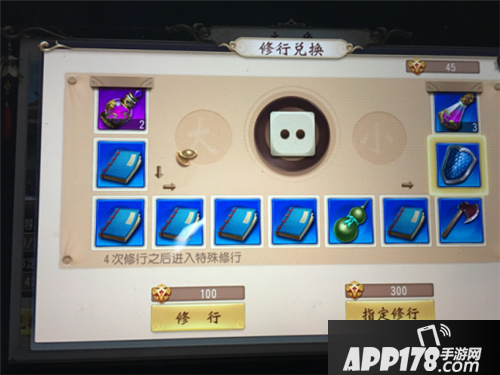 这时你就闭着眼睛点修行吧,每次100点,不建议使用指定修行,浪费点数,而且前期的修行奖励都很实用,没有垃圾一说,所以摇到什么算什么,特殊修行就是全部是二级辅助书,随便摇。