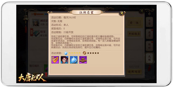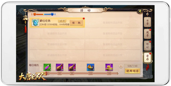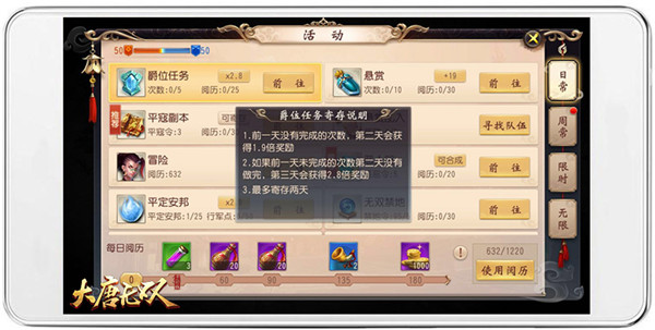 《大唐无双》手游全新的寄存系统,人性化的将好战玩家因为私人事务或者忙于战场激爽战斗时,来不及完成的任务和活动进行寄存保留,留到第二天甚至第三天空闲时再完成,如此一来好战玩家的时间支配就更为自由轻松。并且这样的寄存还会给翻倍“利息”。玩家们就无需每日还要劳神费力的去计算分配游戏时间,只要开启寄存系统,让任务和活动先养肥了再杀,这期间尽情的去享受战场厮杀的刺激与乐趣。