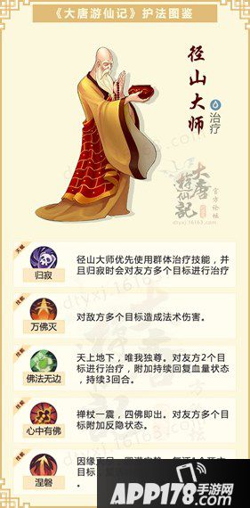 大唐游仙记护法都有什么?径山大师厉害吗?下边就让小编来为大家详细的介绍一下游戏中的强力护法径山大师都有什么样的能力吧!