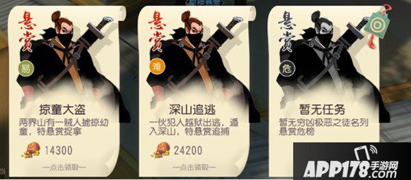 只要完成官府的悬赏任务,就能获得丰厚的赏金,推荐每日完成。官府悬赏分为三个榜,易榜和难榜单人即可接取,带上护法战斗,难度不算大。危榜不定时放出,需要组队才可以接取,有一定的难度。