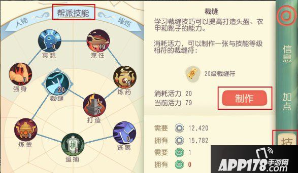 生活技能学习到一定等级,就可以利用该生活技能生产物品。以裁缝为例,学习到20级时,点击“制作”可以制作20级裁缝符。