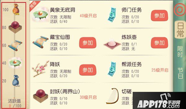 点击左上角的“活动”按键,可以打开活动界面,界面的左侧会显示当日的活跃度以及可以获得的奖励,参与的活动任务越多,活跃度越高,可以获得的金币、银币和道具就越多。
