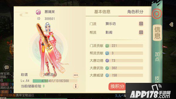 2、现在就点最右侧的角色积分,就能看到自己的门派信息,帮派信息,这些都不是主要的,重点来了,请注意下