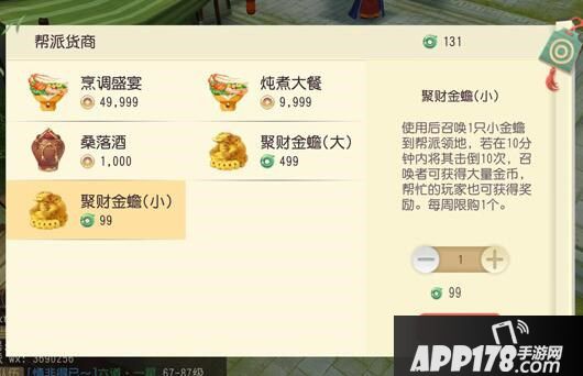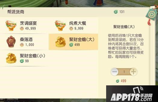 除了帮派宴席,新版本中还开放了聚宝金蟾玩法,这也是全帮人的福利活动,玩家可前往帮派货商处购买金蟾,使用后将在帮派领地放出一只活蹦乱跳的聚宝金蟾。
