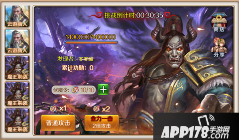 最最有挑战的就是魔王来袭了,因为仅凭一人之力是很难成功弄死魔王的,这个时候就是考验你人缘的时候了,点击分享给好友,让好友来帮你一起打,BOSS死后大家一起来分赃~~击杀BOSS可以获得相关的功勋积分,在商店里兑换相关道具,是不是很赞呢?