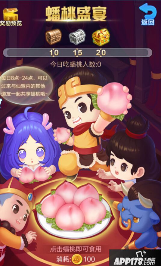 每天在游戏里可以通过仙盟界面进入蟠桃盛宴的界面,然后点击界面上的蟠桃进行食用,在8点—24点都可以进行。每天有一次食用的机会,每次都会消耗一定量的仙盟贡献,回报就是一定数量的体力~要注意的是,获得多少体力会与仙盟等级挂钩哦,所以要努力提升仙盟的等级,当每天同仙盟吃蟠桃的人数达到一定数量时,整个仙盟的道友都可以领取对应的宝箱奖励,但是每天每一档位的宝箱奖励只能领取一次哦~