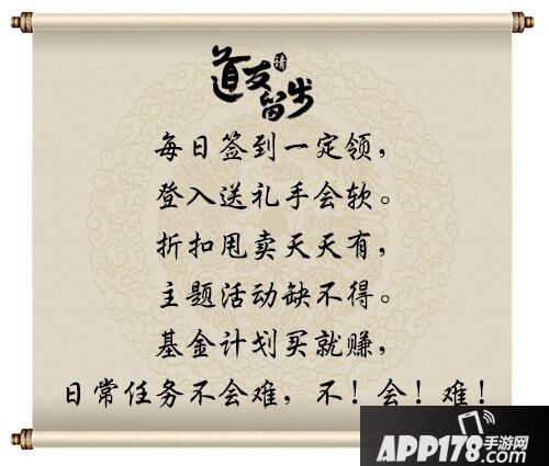 道友里的每日签到正的是我见过最土豪的,送元宝,送神仙,送礼包游戏里有的它都送!!还有只要你充值6元以上你就可以领取豪华礼包,豪华礼包里的宝贝正是让人闻风丧胆元神、突破丹、精练石每天换着法子给你送。