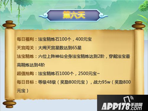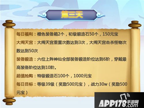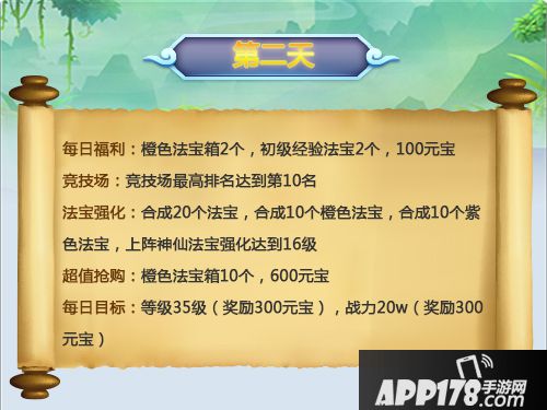 这一天就是开箱子,然后去合成法宝,开箱子的时候有个小技巧,建议大家开一个箱子开到紫色或者橙色碎片就去合成,避免开到同一个法宝的不同部位碎片而浪费了一个法宝合成的机会,同时抢夺玩家宝物碎片的成功概率会更高。完成寻宝任务还能获得大量的法宝碎片,另外可以在第一天买3-5个箱子,第二天也买3-5个箱子,比较实惠。竞技场的部分建议可以等到10点之后找前面的玩家借位,大家都是善良的~