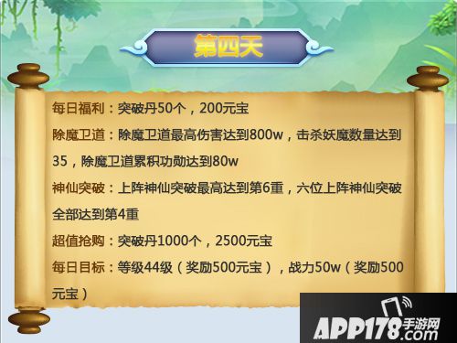 这一天准备1个没有培养过的紫将,然后狂点突破,达到第六重领取了奖励之后可以将其重生,均衡突破上阵的神仙,在除魔卫道中的商店也全部兑换突破丹,从第一天就开始攒突破丹。除魔卫道的部分尽量打满奖励要求。除魔卫道在除魔令不够的情况下可以用显妖符招出怪物,和平的可以直接获得功勋奖励,怯弱的怪物攻打有功勋加成,碰到会浪费多个除魔令的怪物可以选择放弃,等时间到了之后自动消失。