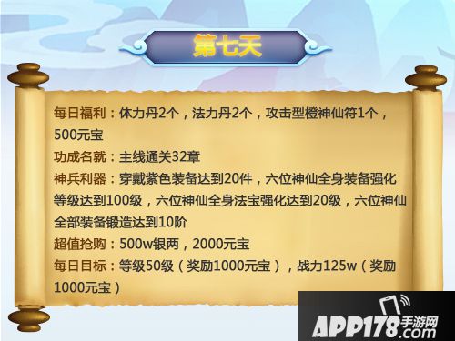 七日活动是道友为所有新玩家准备的开服活动,按照完成任务将会获得大量奖励,也能感受到战力飙升的快感。万事开头难,有个良好的开始就是成功的一半,接下来就让我来为大家讲解一下道友中的七日活动,七日活动每天都有等级和战力要求,v4或v5开局能够比较轻松地完成大部分的任务,每天的体力丹建议买满,法力丹也尽量买到15个以上,如果情况允许的话也建议买满,因为法宝对于法力丹的消耗还是比较大的。同时记住最重要的一点,每天的限时抢购一定要记得完成,还要记住的一点是,七日活动是在七日内完成都做数的,所以不要因为今天没有完成某个任务而懊悔冲动投入,要合理分配资源和元宝。