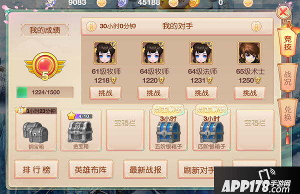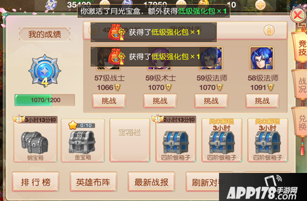 描述:挑战对手,前5次可获得高额的经验和钱币,开启竞技场宝箱更有丰厚奖励
