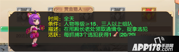 条件:人物等级≥15,三人以上组队活动描述:完成邢殿长老交给的任务,捉拿多名赏金榜的逃犯,可获得经验,并有概率获得绑银和物品奖励。(每天可以获得一定次数的“悬赏加成”效果)