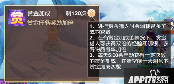 ps:赏金加成可以在主界面右上角玩家头像隔壁可以看到,每天至少会有60场次数的加成,并会清空前一天剩余次数。每一场悬赏任务战斗后会消耗一次,在有赏金加成的情况下,赏金猎人可获得双倍经验和绑银,获得物品概率加倍。