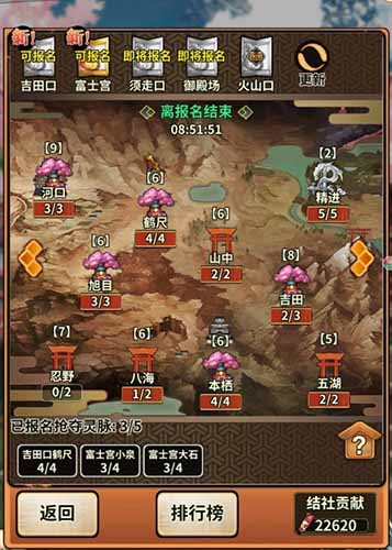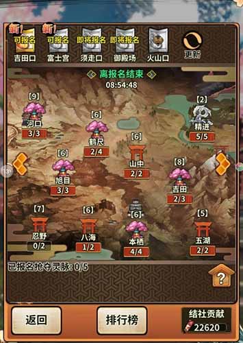 吉田口、富士宫、须走口、御殿场、火山口五大战区将陆续开启报名,每个战区中都有数量不等的灵脉等着占领!玩家们可以查看每个灵脉的争夺结社数量以及自己结社的参战情况,从而决定争夺目标——每人每天只能参与5个灵脉的争夺,一定要和结社内的小伙伴商量妥当集中火力,方能成功夺下灵脉、收获奖励哦!