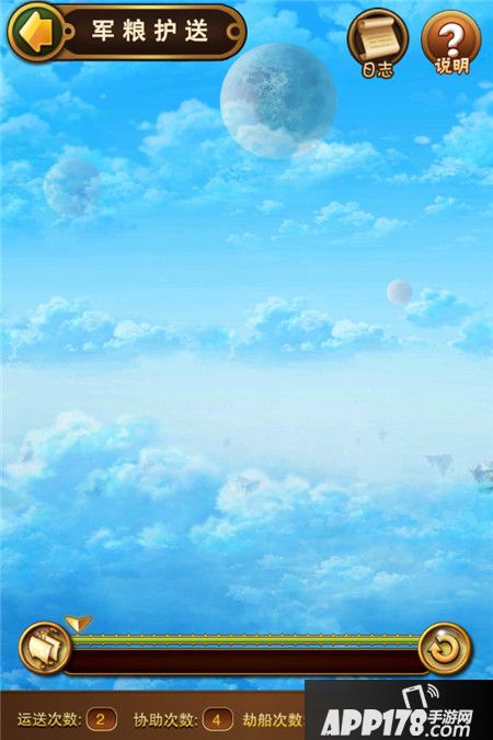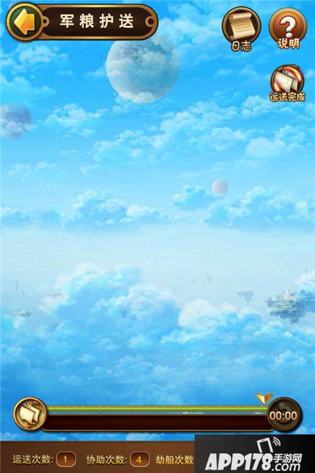 点击进入副本只看见一片蓝蓝的天空,正常情况下会有很多飞艇悬浮在空中的啦!那是其他主公正在做护送任务。护送过程中,别的主公可以来抢劫船只,至于能不能打劫成功就要看各位主公的能耐啦!