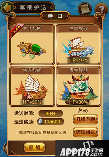 主公等级成功到达28级后,开启军粮护送系统。系统会赠送给你一艘很普通的小船,可以点击“升级空舰”来获得第一次免费的升级,每次升级小船都可能变的更有逼格;与此同时,如果运送货物成功还有百分比奖励加成哦!