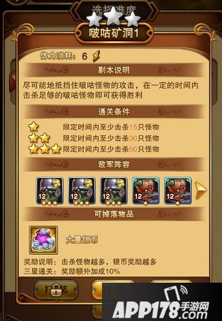 两个玩法都是点击进入矿洞按钮后打开玩法说明及界面,点击战斗则进入难度选择界面,选择好难度就可以进入战斗了,每次挑战消耗6点体力,每天可挑战5次。两种玩法随着等级的提升,可以体验更高难度的关卡,但必须通关前面的关卡
