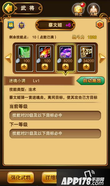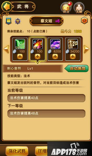 抚心小曲:蔡文姬的主动技,法术治疗,24秒冷却时间,怒气消耗200,每次升级增加6点治疗量。