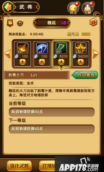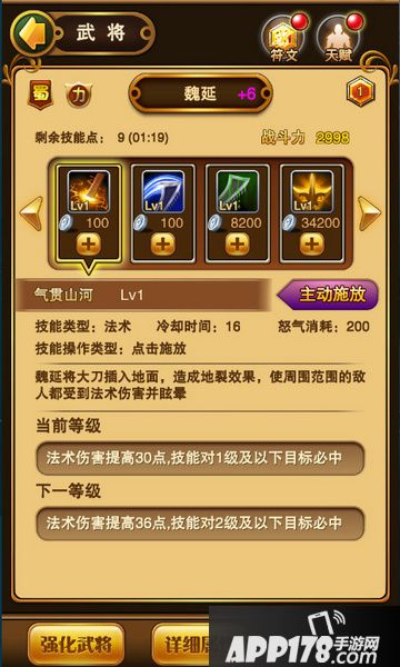 气贯山河:魏延的主动技,法术攻击,16秒冷却时间,怒气消耗200,每次升级增加6点伤害。