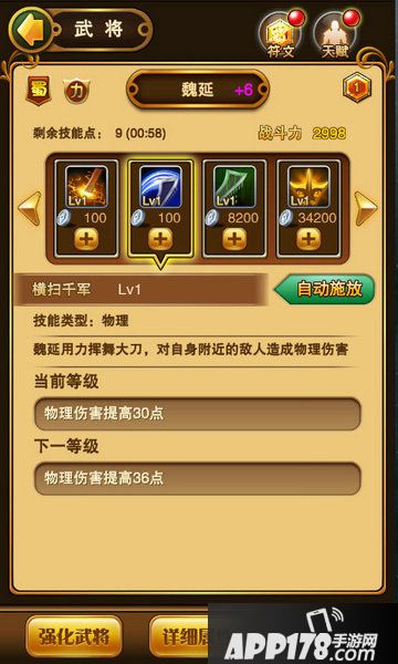 横扫千军:自动技能,对自身附近敌人造成伤害每次升级增加6点伤害。