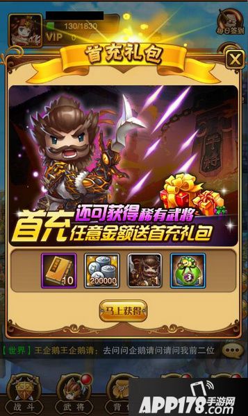 首充任意金额,就可直接获取三星武将,每位主公仅有一次机会。