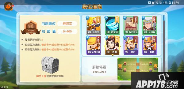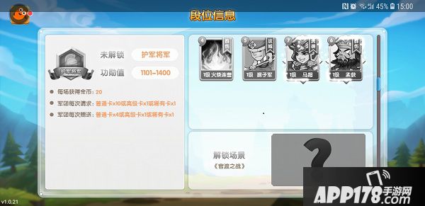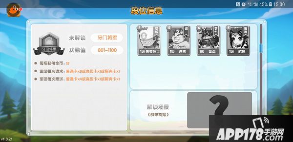 游戏里面一共有11阶段位,满足功勋值即可达到相应段位,解锁更多卡牌、场景和获取更多金币,以下是1-5段位的内容: