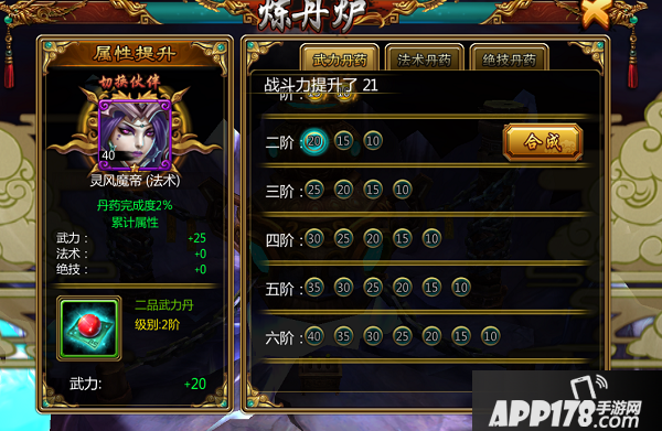 当游戏进行到一定进程后,就会开启【炼丹炉】,就可以进行丹药的合成了。丹药将进一步提升对应将领的属性,是一种非常强大的宝物。