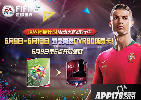尊敬的各位玩家,四年一度的世界杯即将开幕了,《FIFA足球世界》也启动了奖励丰厚的世界杯的倒计时活动!只要您在指定活动时间登录游戏,就可以免费领取一张OVR80的精英球员卡!活动总共分为两个阶段展开,只要您在全部的活动时间登录,就可以获得两张OVR80的球星卡!