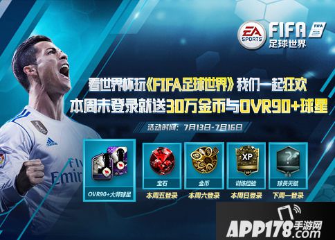 本周五(7月13日) - 下周一(7月16日)连续四天登录《FIFA足球世界》即可获得:4-10名球员天赋,15,000金币以及1,500经验值。奖励将在下周二下午(7月17日)发放到您游戏内的收件箱中,请注意查收。