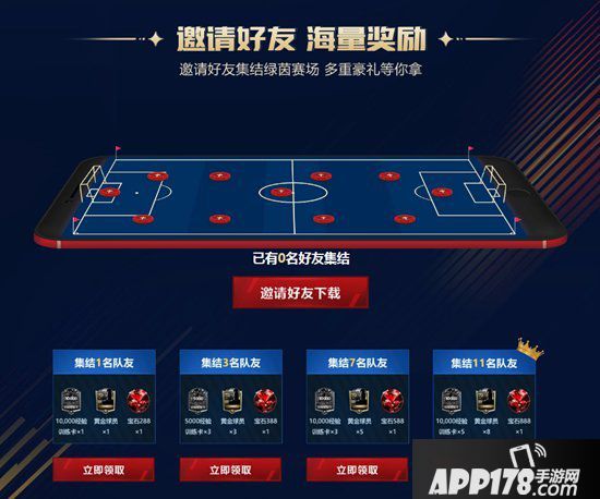 集结 1 名队友:10000经验训练卡*1;黄金球员卡*1 宝石288*1