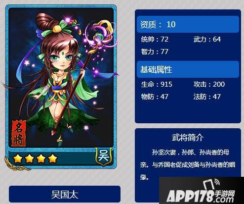 以上就是放开那三国吴国太属性图鉴的全部内容,希望能给喜欢吴国太的小伙伴们带来帮助。更多 相关攻略稍后送上~请继续关注APP178手游网~更多精彩期待你的分享~