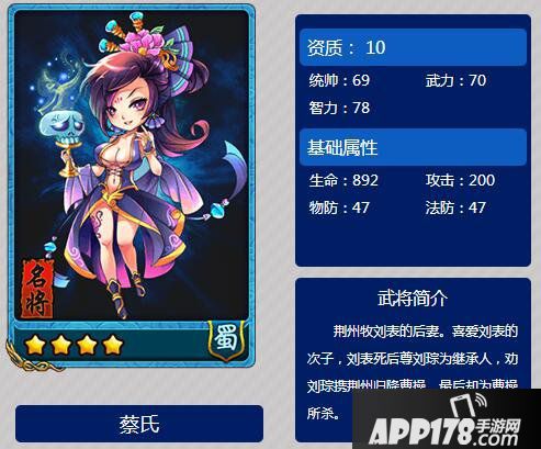 以上就是放开那三国蔡氏属性图鉴的全部内容,希望能给喜欢蔡氏的小伙伴们带来帮助。更多 相关攻略稍后送上~请继续关注APP178手游网~更多精彩期待你的分享~