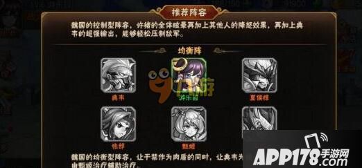 魏国的控制型阵容,许褚的全体眩晕再加上其他人的降怒效果,再加上典韦的超强输出,能够轻松压制敌军。