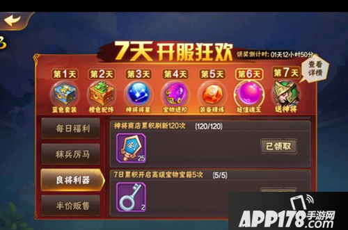 良将利器:神将商店累计刷新120次和累计开宝物宝箱50次,刷新不多说就是有刷新令就刷新商店就行,而宝物宝箱比较麻烦一些,如果没有钥匙开个宝箱分别需要20和40元宝,而钥匙在商店还是比较少见的,所以有的时候必须的买,要是一定要完成这个任务的话,该花元宝还是得花,宝箱的奖励还是不错的。
