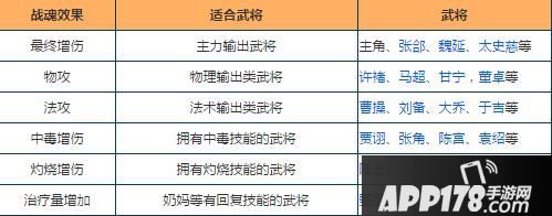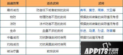 每个武将在阵容中定位不同,核心武将、BUFF武将、减怒武将等等,都有不同的战术地位。小编建议,在战魂数量有限的状况下,对于前排武将优先上物防和生命战魂;对于核心攻击武将,优先上攻击和物攻(法攻)战魂;对于后排辅助武将可选择法防和生命战魂;对于奶妈,我们就要选择治疗量和终伤战魂。终伤战魂(提升最终伤害)、终免战魂(提升最终免伤)、火抗战魂、毒抗战魂等目前收益较低,不建议前期携带,如以后有多余战魂位,可选择此类战魂。