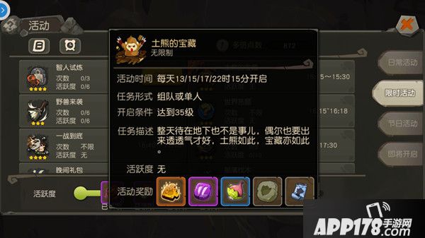 土熊的宝藏活动在玩家等级达到35级的时候开启,每日13/15/17/22时15分开启,每次开启会持续15分钟,既可以组队参加,也可单人参加,活动奖励为橙宠碎片和高级战宠技能和海螺券等,就这个活动等级而言,可以说是非常丰厚了。