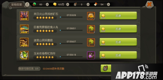 如果对系统派发的任务不满意,可以通过探索毛刷刷新,分配新的任务。一般来说,任务等级越高,所需的时间越多,奖励用丰厚。使用金贝可以加速任务完成。