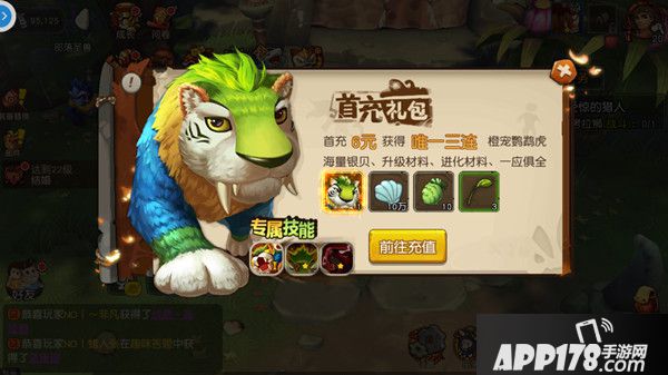 提到充钱,首先要提到的就是首充了。首充礼包一般都是6元起步,一般来说性价比是非常非常非常高的。先以王者荣耀为例,首充6元可以获得永久英雄赵云,6元对于大家来说也就两瓶肥宅快乐水的价格,但是在王者中购买一个永久英雄则是至少需要几千金币的,需要很久的时间才能攒齐。在原始人中也是相同的道理,鹦鹉虎作为SSR宠物,需要40块橙宠碎片才能获得,而每次完成副本,只能获得1块碎片,算上宠物探索获得碎片的概率,在你运气非常好的情况下也要差不多10天才能凑齐40块碎片,10天时间,你与别人的差距已经拉开了,况且之后进化还需要消耗大量的碎片,与其用碎片来合成宠物,不如将其作为之后进化所需的素材。
