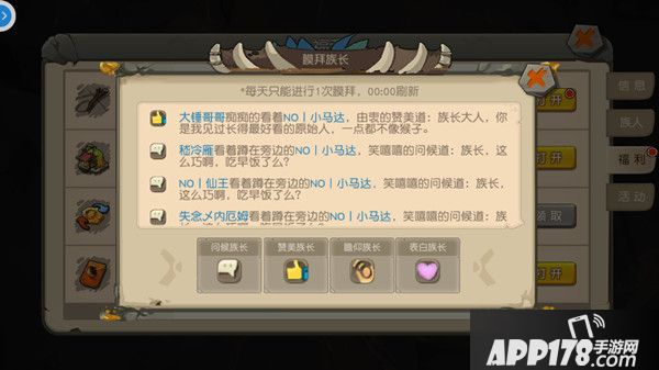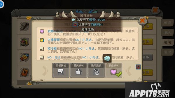 在膜拜组长中,可以选择对族长进行问候、赞美、瞻仰和表白,膜拜的方式只有名称上的区别,在成功膜拜后可以获得银贝和百炼石奖励。