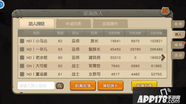 在族人一栏可以看到当前部落的所有族人情况,族人职务包括族长、副族长、建筑师、军需官、女祭司、长老、精英、族人和游民几种。当你对自己的部落不满意的时候,可以点击“脱离部落”按钮重新恢复自由人身份,另寻他处;如果你是对族长有意见的话,则可以点击“弹劾”族长按钮对族长进行弹劾,当族长同时被族内多名要务人员弹劾时,族长就会被罢职,沦为族人,副族长继而成为新的族长。