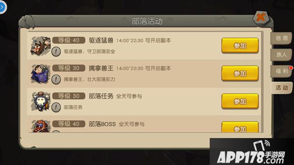 部落活动一栏下可以快速参加各类部落的活动,包括部落副本、部落任务、部落BOSS、部落强盗、部落战争等等,完成部落活动可获得大量银币以及部落贡献奖励。