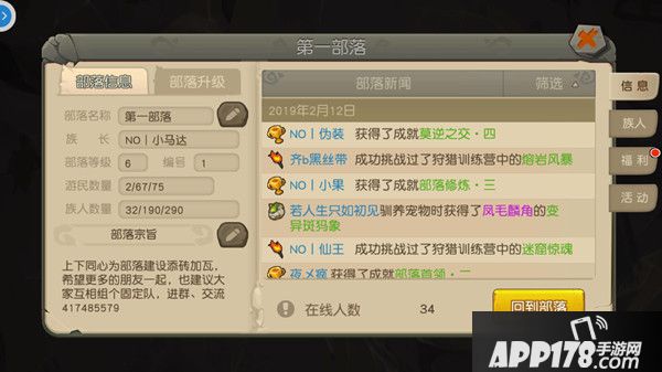 在信息一栏可以查看自己部落的有关信息,包括部落名称、族长、部落等级、族人数量等信息。同时部落新闻下可以看到部落的小伙伴们最近完成了哪些成就。点击回到部落按钮,可以回到自己部落的驻地中。