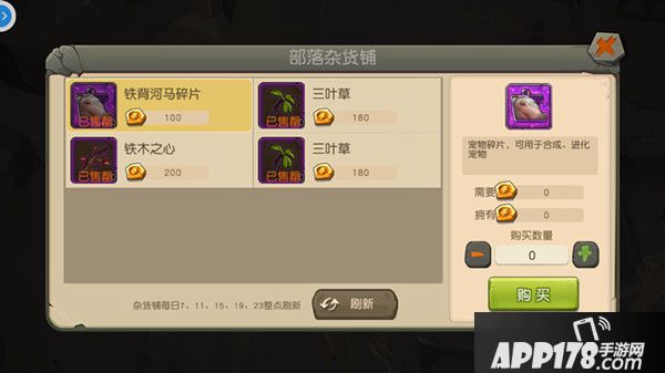 在部落杂货铺中可以使用部落贡献购买紫宠碎片、宠物进化道具和装备强化道具等。而杂货铺中每次刷新的道具数量是有限的,种类是随机的,一旦被抢购一空,就只有等待下次刷新了,所以如果有某种特别需要的道具的话,建议在刷新之前提前准备好进行购买。
