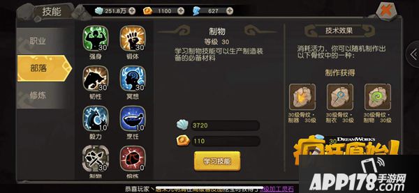 但是想要制作出高等级的装备,除了部落等级够高之外,还需要自己把部落技能升级,升级需要消耗一定的银贝和族贡。等级越高,所消耗的族贡越高。