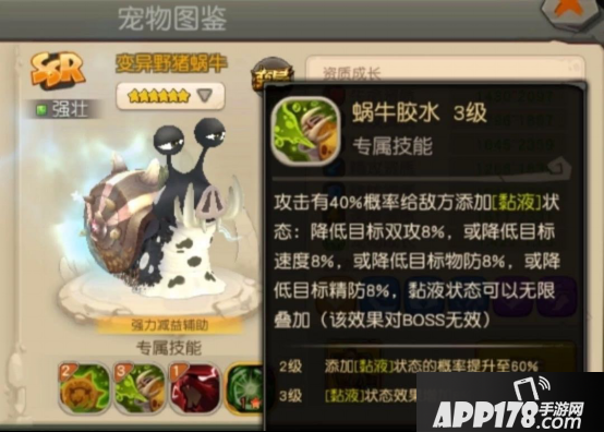 3.蜗牛:60%概率给4个目标减16%的属性(双攻双防速度五选一),可以无限叠加,不限回合数!pk神宠有没有?肉盾克星有没有?推荐加点:3体2耐(持续消耗宠,速度没有需求,而且肉起来简直丧心病狂)