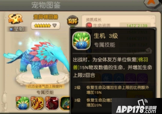 锦羽兽的技能相当实用,全场加血两千多堪比一个奶妈的作用,而且因为需要加力量属性来提高奶量,输出也不差,推荐加点4力1耐(体)加点,推荐技能:吸血、强壮、顽强(重生)、光明、抵抗等(特殊作用辅助宠都应该以生存为第一要务)